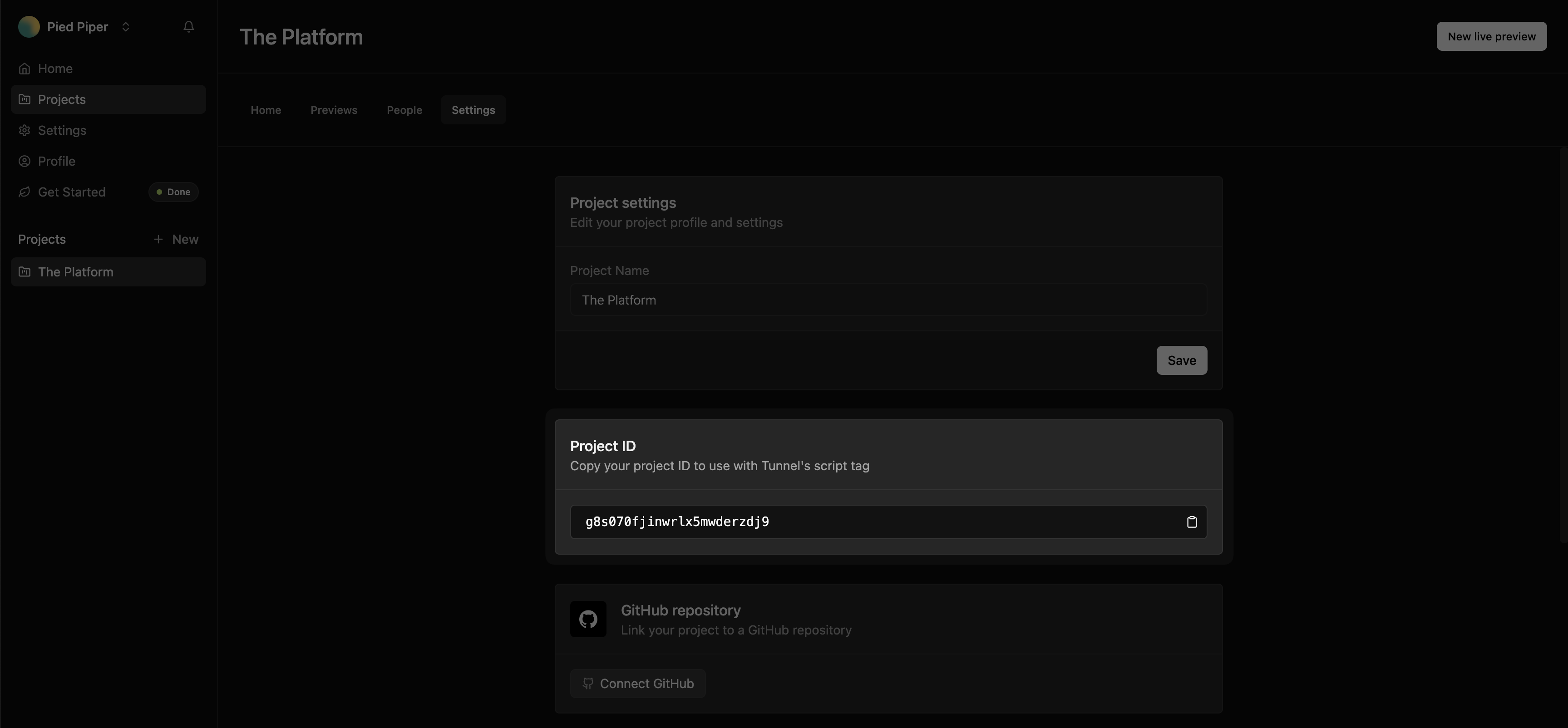 To copy your Project ID, navigate to the Tunnel Dashboard, select your project, and go to Settings to copy your project ID.