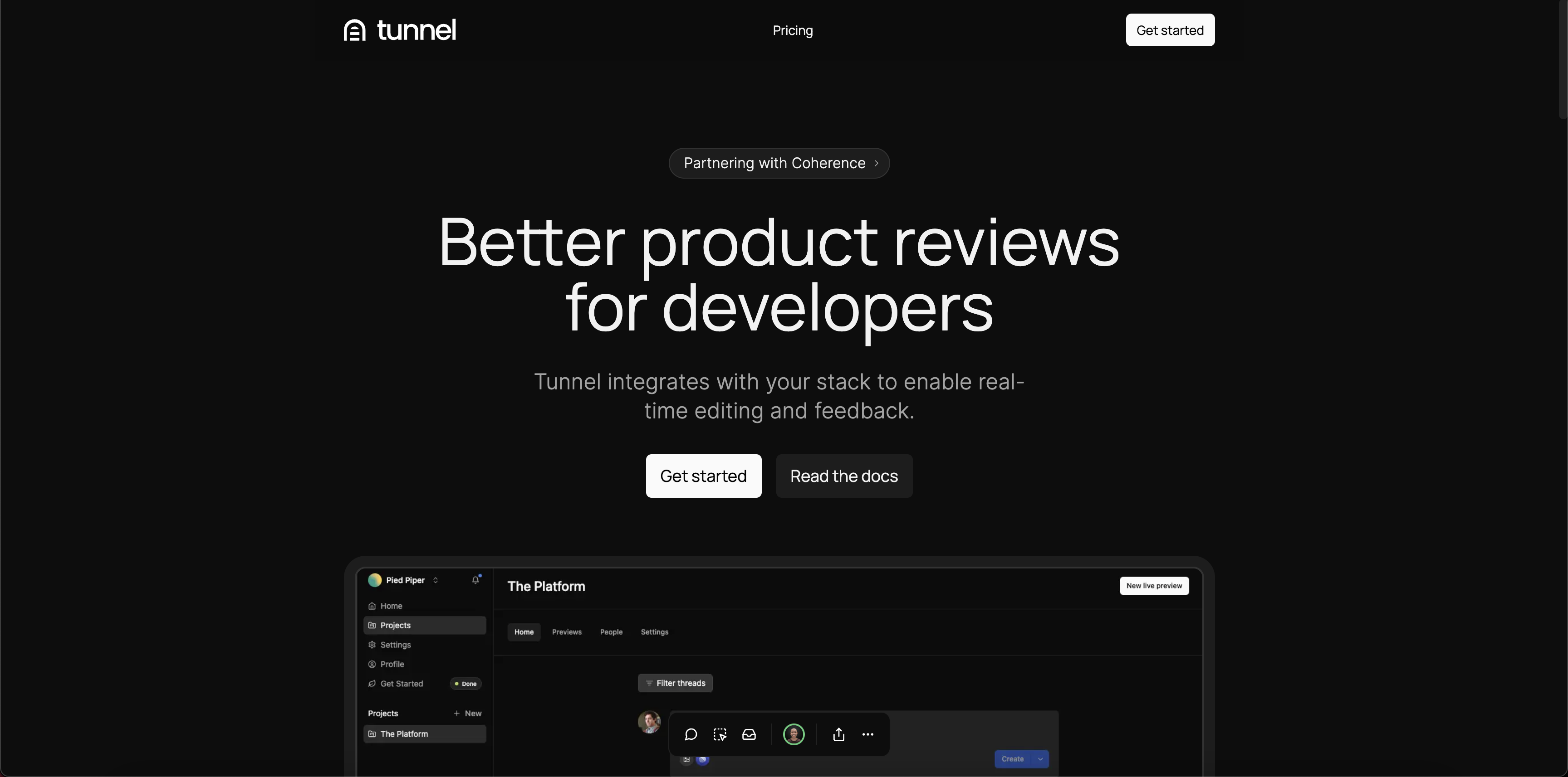 To enable Tunnel in your app, add the<TunnelToolbar /> component to your app. For now, we have specialized SDKs for React and Next.js apps, but if you’re using another framework, you can still use Tunnel by adding the <script> tag to your app.