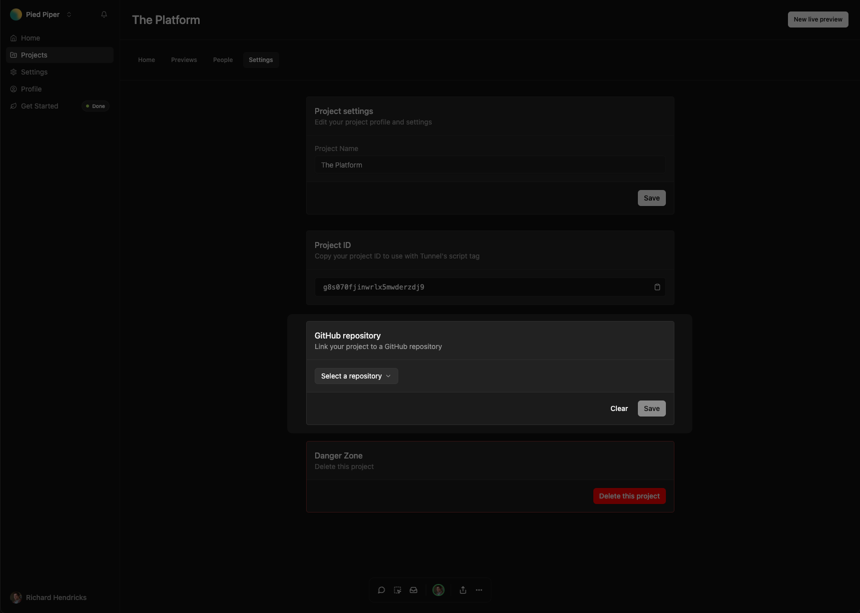 With your Github organization connected, you can link repositories to projects in Tunnel.Link a repository to a new project