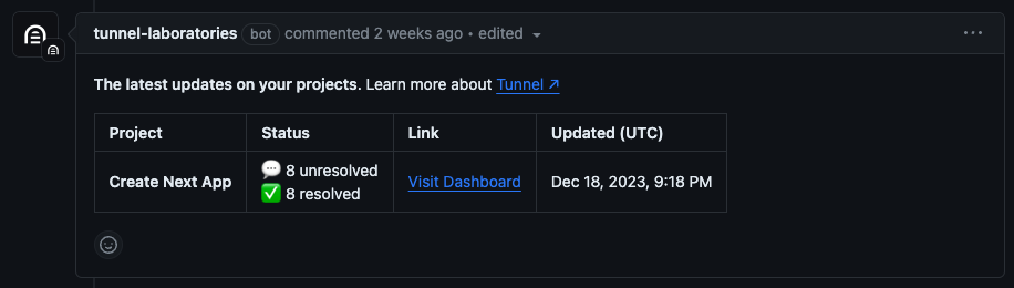 Pull requests receive generated PR messages from the Tunnel bot. The PR message tracks how many comments have been resolved and how many are still open. The PR message is updated every time a comment is resolved or reopened.