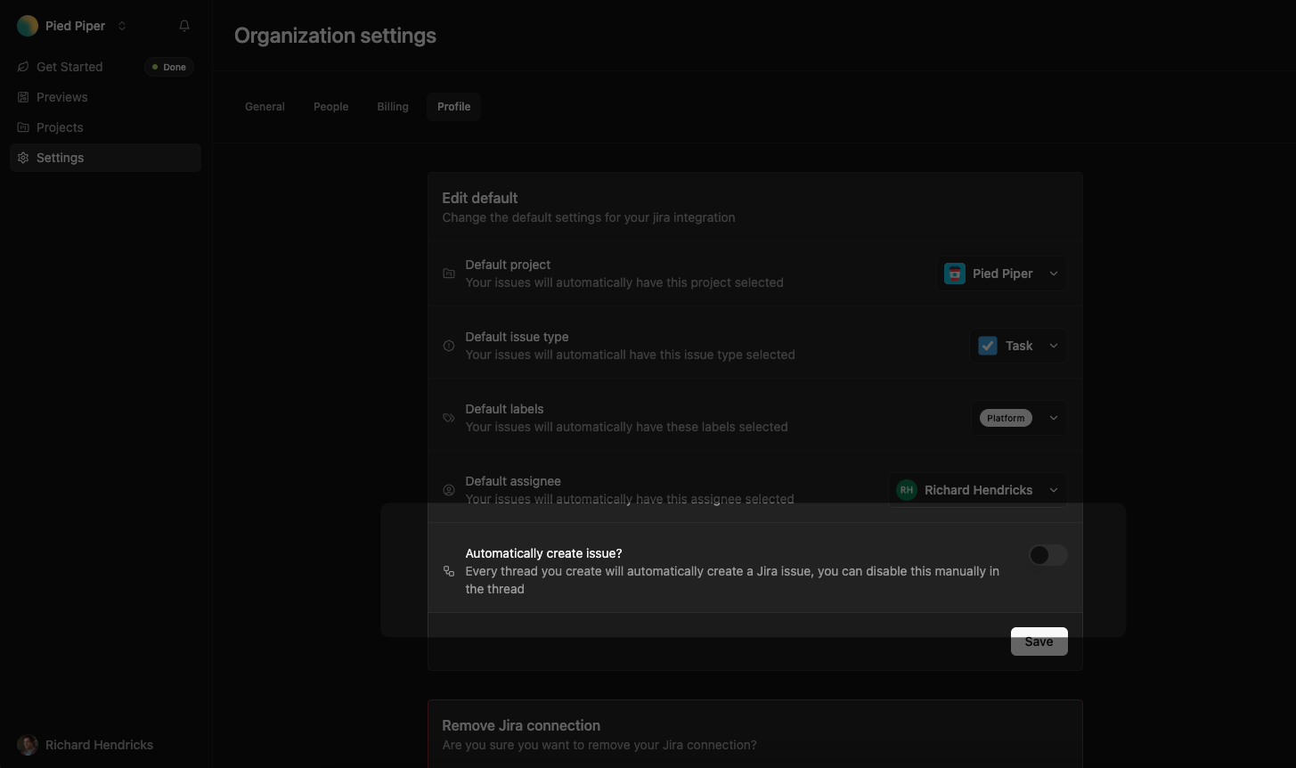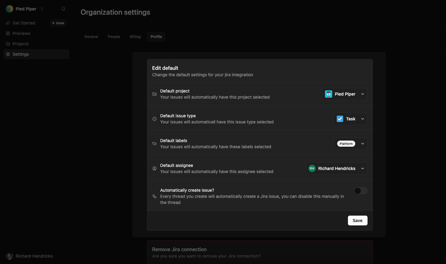 Go to the Tunnel Dashboard and navigate to Settings > Profile. Scroll to the Integrations section and click Manage in the Jira row.From here, you can set a default Jira project, and then set default values for issue type and assignee. You can also set default labels.