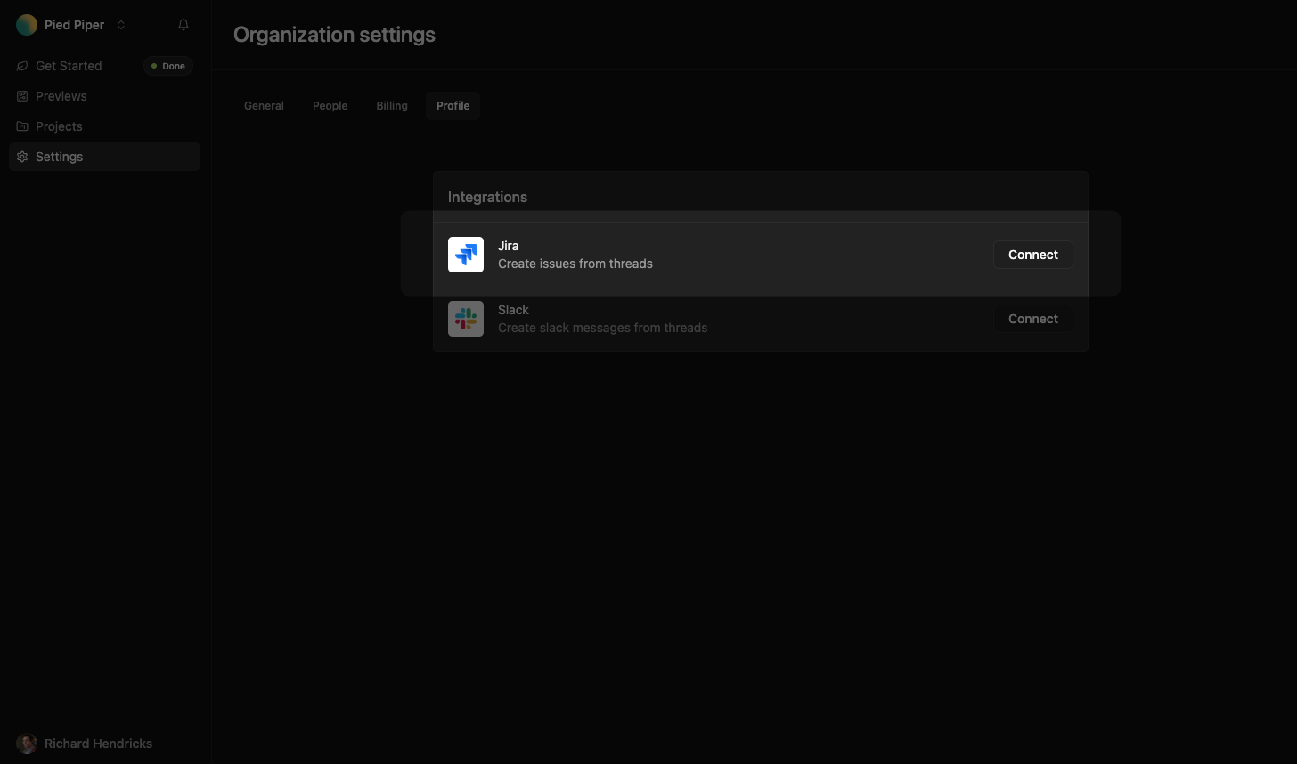 You can configure the Jira integration in the Tunnel Dashboard by navigating to Settings > Profile and scrolling to the Integrations section.Connect Jira