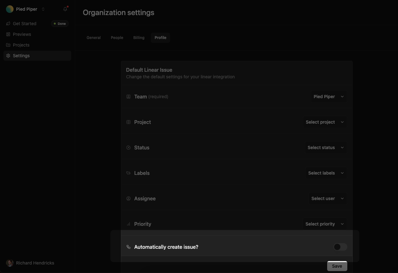 Go to the Tunnel Dashboard and navigate to Settings > Profile. Scroll to the Integrations section and click Manage in the Linear row.From here, you can set a default Linear team, and then set default values for project, status, assignee, and priority. You can also set default labels.