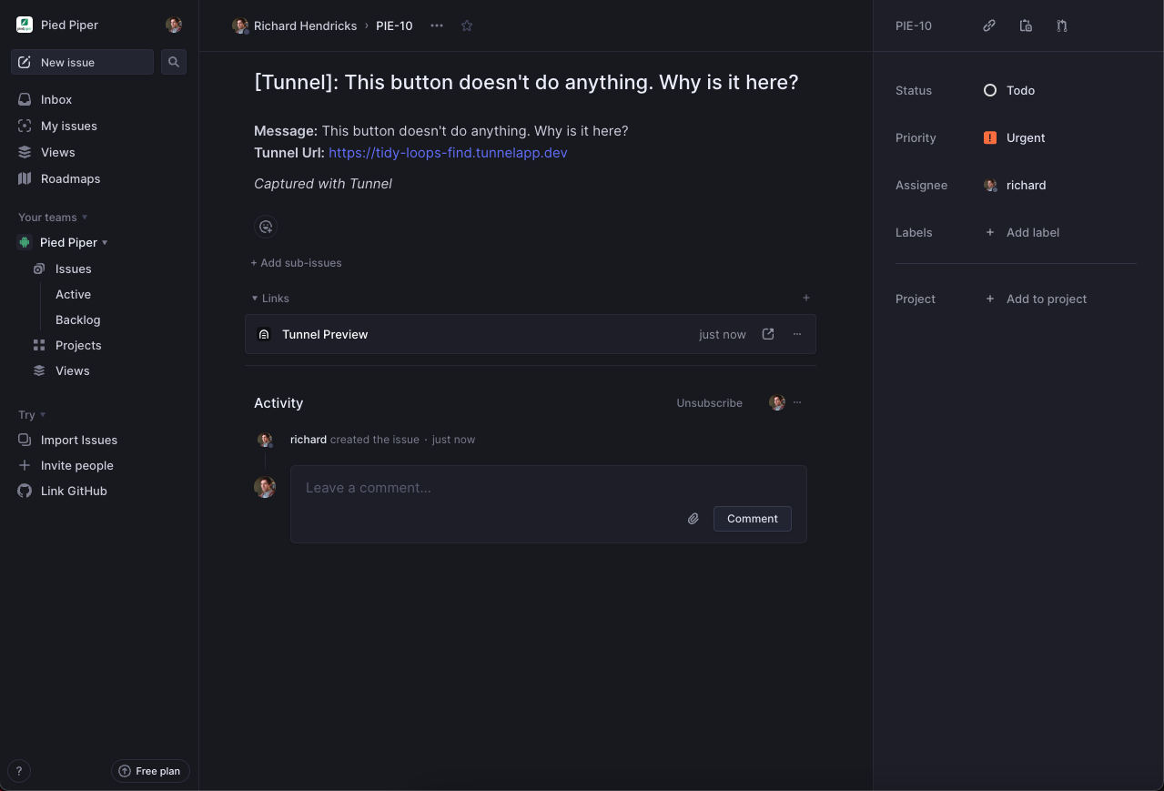 With your Linear account connected, you can create issues in Linear from Tunnel comments.1
