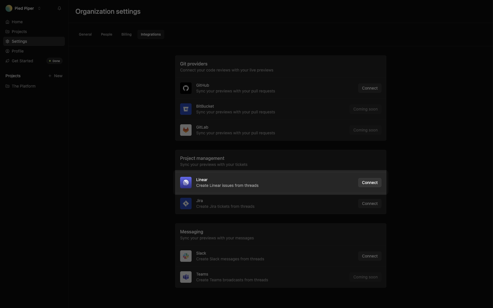 You can configure the Linear integration in the Tunnel Dashboard by navigating to Settings > Profile and scrolling to the Integrations section.Connect Linear